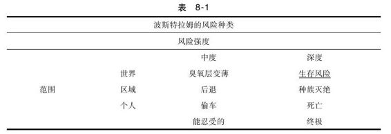接下来我们将讨论用于解决这些严重危机的步骤,但是我们不能保证今天设计的策略完全有效。这些风险即尼克·波斯特拉姆所谓的“生存危机”,他将此定义为表8-1右上角的危险深度。18