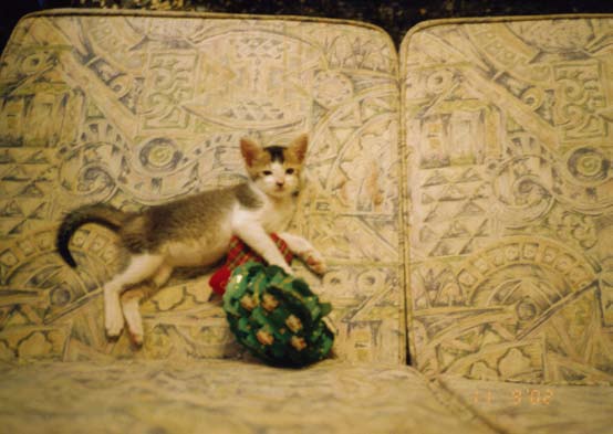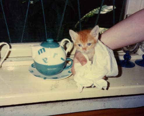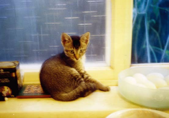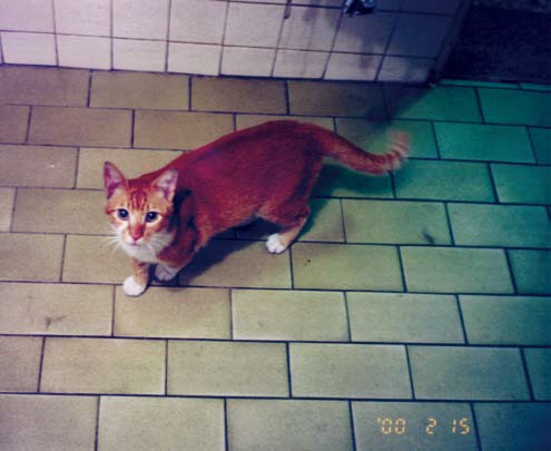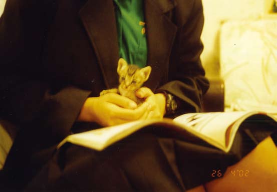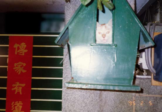 极有可能叫你严重失望的,你收留的是一只与荒野猎人形象大异其趣的胆小鬼,这平常得很,几乎每一只流浪小野猫都有一段辛酸史,跟丢妈妈的,或因弱小残疾被妈妈(包括大自然)遗弃的,或妈妈因故回不来的……我们家猫史上公推最胆小的APEC就十分典型,他被妈妈挪窝挪到正在整修的空屋人家的冷气口缝中,妈妈不知何故不再现身,呸咕(APEC的小名)大哭了一整天,声震方圆数十公尺,弄得隔条巷子的我们一天被喵呜得啥事都做不了,心肠最软的天文终于掷笔前往探看,发现猫妈妈果然把他藏得好,就算擅闯人家空屋一楼二楼都够弄不到,天文只得拜托正要收工的水电工,水电工好心愿意帮忙,用个超级大扳手胡乱大力地敲打冷气,用的是暴力法。