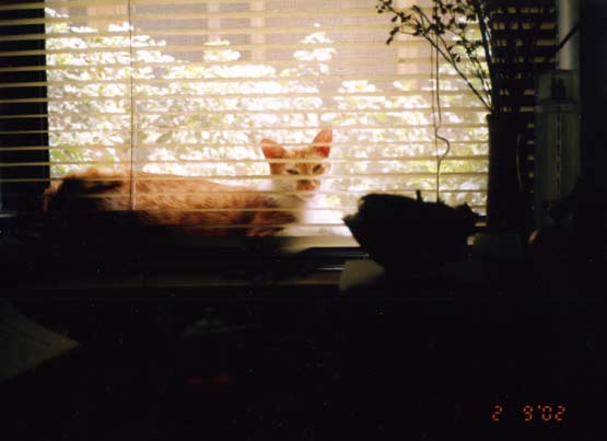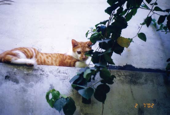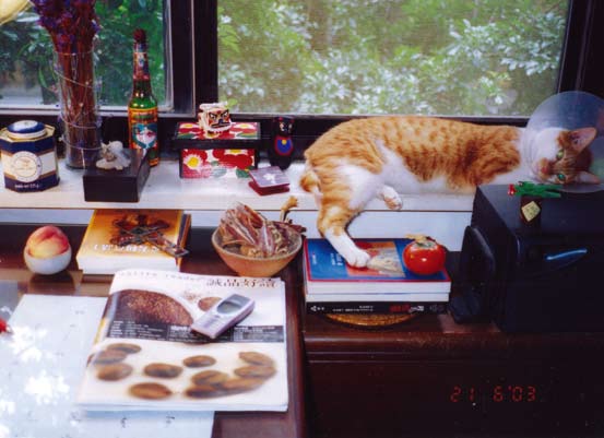 半小时下来,人猫皆给震昏,所以起初天文还担心呸咕会因此成个聋子。但这担心全没必要,呸咕吓坏了,所以破例没放在一楼起居室与众猫众狗众人试着相处适应,天文把他携进卧室,他自此钻在书桌与墙角间,一点风吹草动(所以没聋)就不见人影,差不多要到一个月以后我们才稍能见到他。呸咕是一只黄虎斑白颈腹的公猫,通常这款花色的公猫,话多,大派到接近厚脸皮地步,是次于虎斑灰狸公猫与人关系黏腻的。APEC 完全破例,即便对最信赖的救命恩人天文仍非常含蓄拘谨,天文有空时故作疯癫逗他,想让他放松片刻也算心灵治疗一番。APEC从不为所动,只缓步退到远远的窗台上蹲踞,忧虑地注视着天文,断定她是个疯婆子。