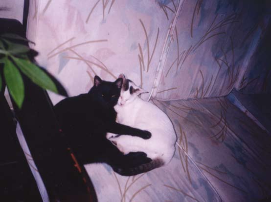 萨斯妈妈半点没被我们感动,而且她严禁小猫对我们有感情,所以尽管每天晚上八点左右他们母子仨早等在校园夜黯的角落,见了我们老远飞奔迎上,两只小的,小狸狸、小贝斯(长得像我们家贝斯)已经被我们喂得好大了,但被妈妈教得极严格,一面不忘发出“赫、赫”的喷气威吓声,同时刻的肢体语言是爱悦幸福地打直尾巴、四脚轮替踩踏着(吃奶时推挤妈妈胸怀的动作)。言行不一,莫此为甚。