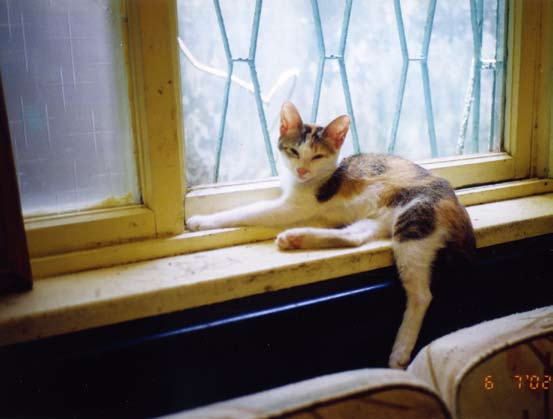高高是一只三花玳瑁猫,流浪来时半大不小,智能毫无开化,大大违背她这花色该有的聪慧,而且她只对吃有兴趣,吃完就窗边坐着发傻。她骨架粗大,两只大眼毫无表情,好大一尊复活岛史前巨石像,常把过路的猫族狗族们看得发毛跑人。