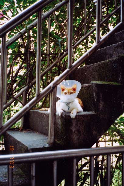 我们近期的猫史上就曾有那样一只大猫王,金针。金针与他的同胞兄弟木耳还没断奶就被邻居当垃圾一样丢给我们。针针黄背白颈腹,个头不大,身体自小毛病不断,主要是皮肤病,尤其他每一远游出巡回来,旧伤未愈又添新伤口,最难好的是脖子连肩胛一处,那伤疤跟了他一辈子,老是化脓发炎,我们不敢给他戴兽医一般处理这种状况时给戴的维多利亚女王项圈,怕他在外游荡时会行动不便造成危险,于是天文发明各种包扎法,历经无数次改良,终以一方白纱布,用一种童军绑法斜斜地穿过前脚腋下固定,怕他不耐扯去,每每敷药疗伤绑好后在场的人便齐声欢呼:“太帅了太帅了针塔塔。”