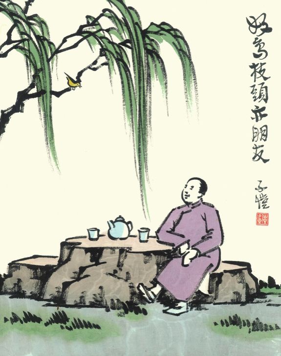 茶越冲越淡,雨越落越大。最初因游山遇雨,觉得扫兴;这时候山中阻雨的一种寂寥而深沉的趣味牵引了我的感兴,反觉得比晴天游山趣味更好。所谓“山色空蒙雨亦奇”,我于此体会了这种境界的好处。然而两个女孩子不解这种趣味,她们坐在这小茶店里躲雨,只是怨天尤人,苦闷万状。我无法把我所体验的境界为她们说明,也不愿使她们“大人化”而体验我所感的趣味。